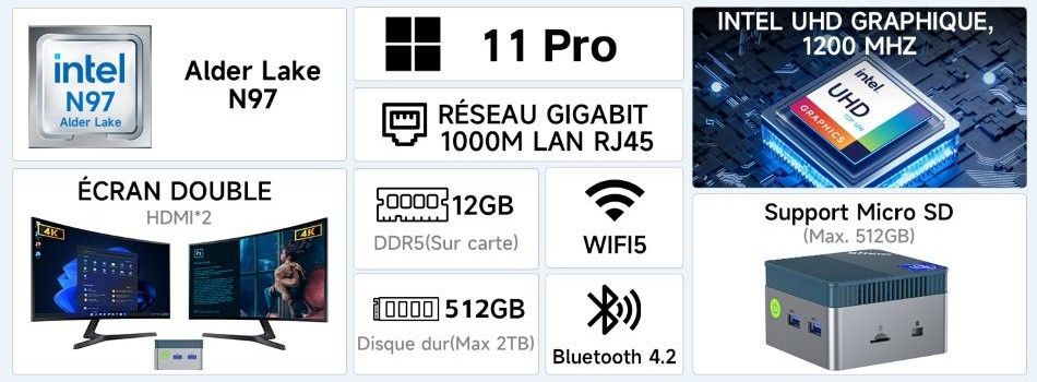 Le GMKtec G5 est un mini PC économique et performant, idéal pour les étudiants, les familles ou toute personne recherchant un appareil compact pour les tâches quotidiennes. Son processeur Intel N97 offre de bonnes performances pour une utilisation générale, et ses 12 Go de RAM garantissent un multitâche fluide. Cependant, il n’est pas adapté aux jeux vidéo exigeants ni aux travaux créatifs intensifs. L’utilisation de normes sans fil plus anciennes et l’absence de SSD NVMe constituent des points faibles, mais à 188 € (Amazon le 05/11/2025), le G5 offre un rapport qualité-prix imbattable.