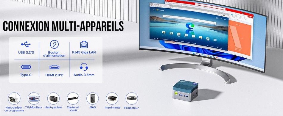 - Conception compacte : Prend très peu de place, parfait pour les petits bureaux ou dissimulé derrière les écrans.
